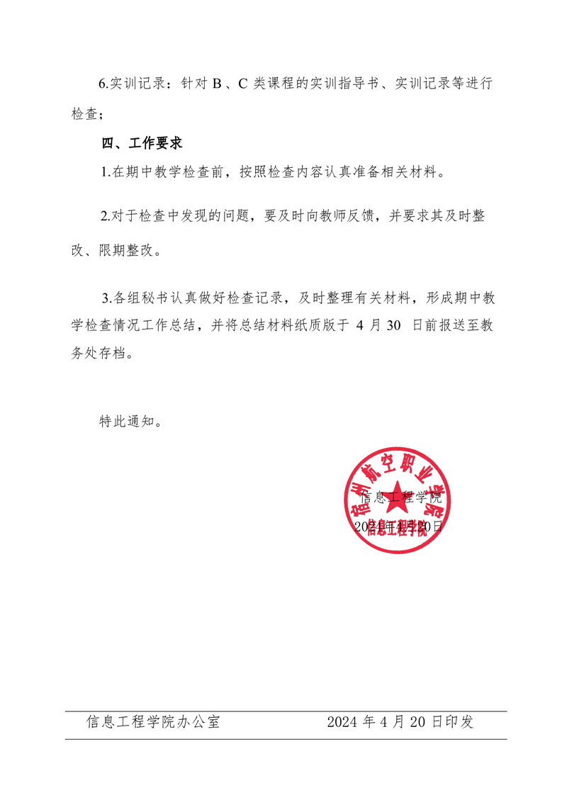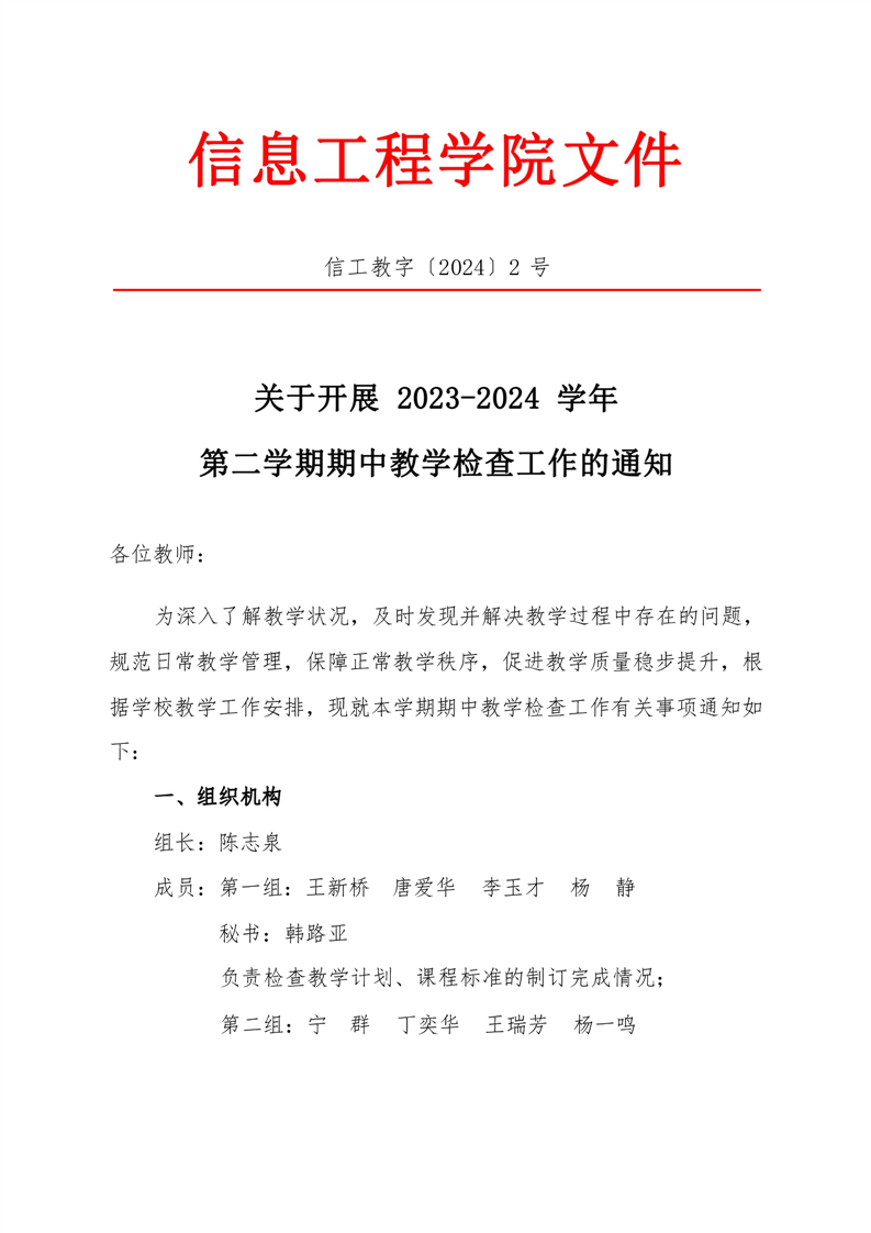 信息工程学院关于开展 2023-2024 学年 第二学期期中教学检查工作的通知