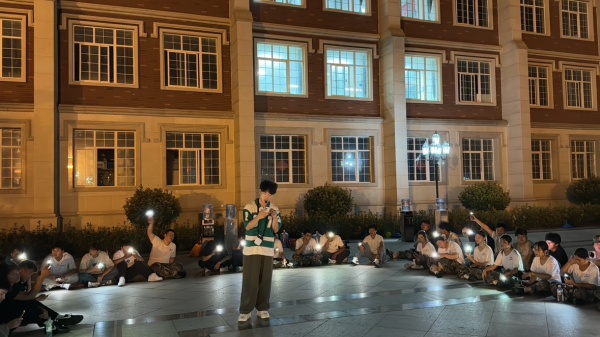 夜幕下的训练场灯火通明👨🏽🎓,歌声飞扬。同学们暂时卸下白天的疲惫,踊跃登台展示才艺。歌曲演唱深情动人,赢得了现场阵阵掌声与喝彩🤺。活动中👰♀️👮🏻♂️,辅导员纪伟也一展歌喉,与同学们互动联欢,将现场气氛推向高潮🤬。